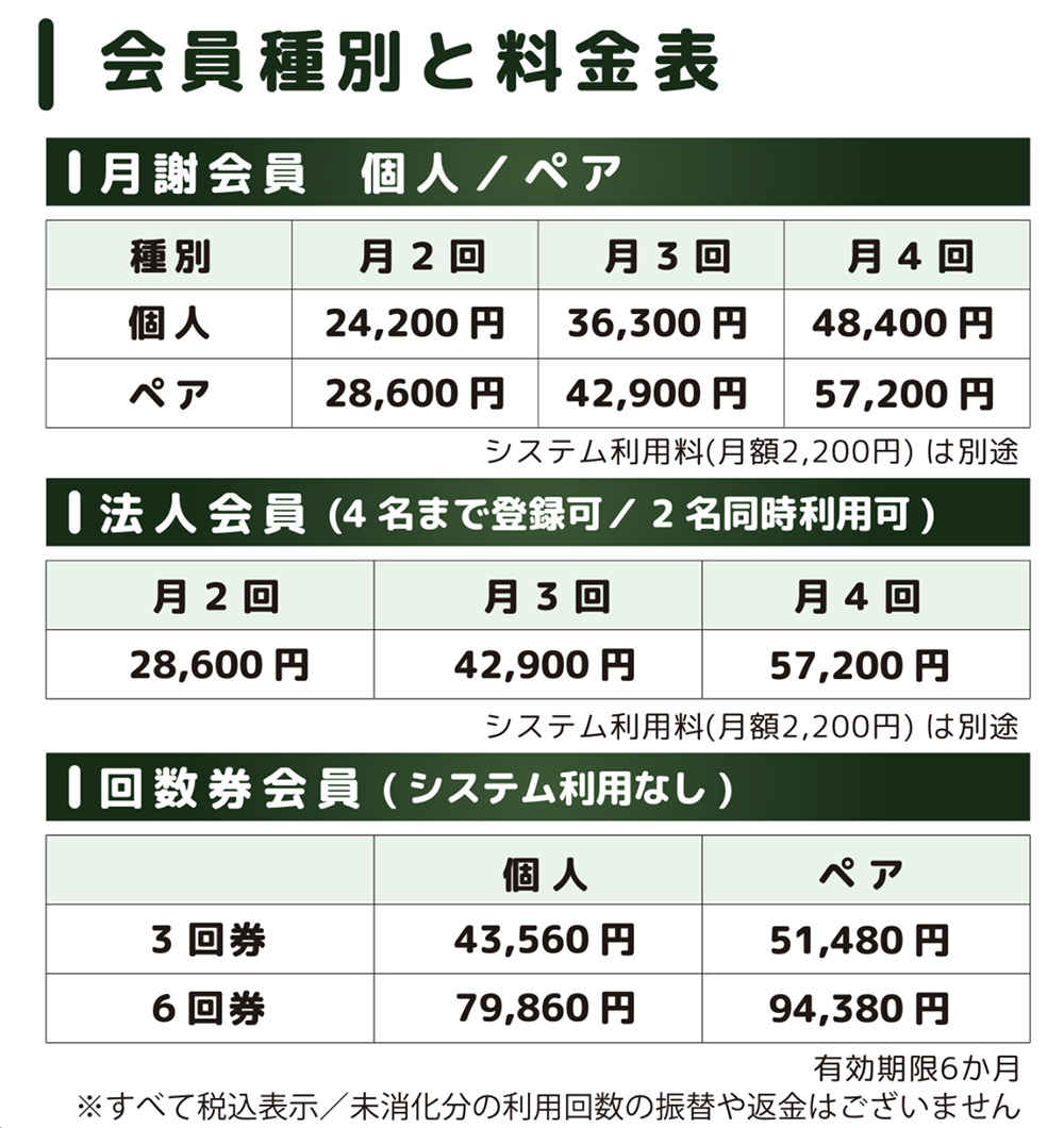 月謝 / 法人会員:アプリ利用またはスタッフが受付